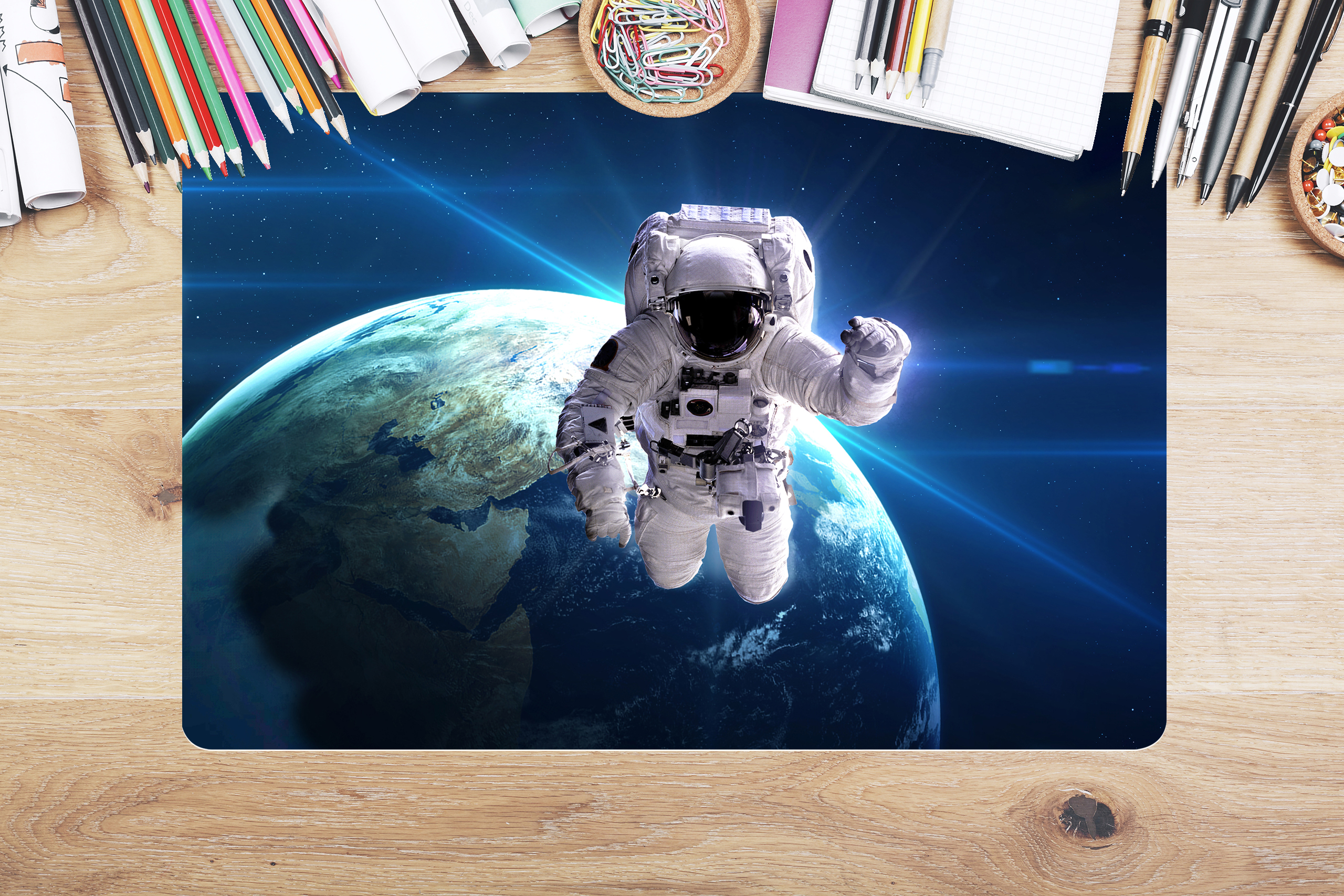 Das kraftvolle Bild eines Astronauten vor dem majestätischen Hintergrund unseres Planeten Erde macht diese Unterlage zum perfekten Geschenk für Weltraumliebhaber jeden Alters. Kinder werden besonders fasziniert sein und ihre Kreativität beim Lernen und Spielen entfachen.