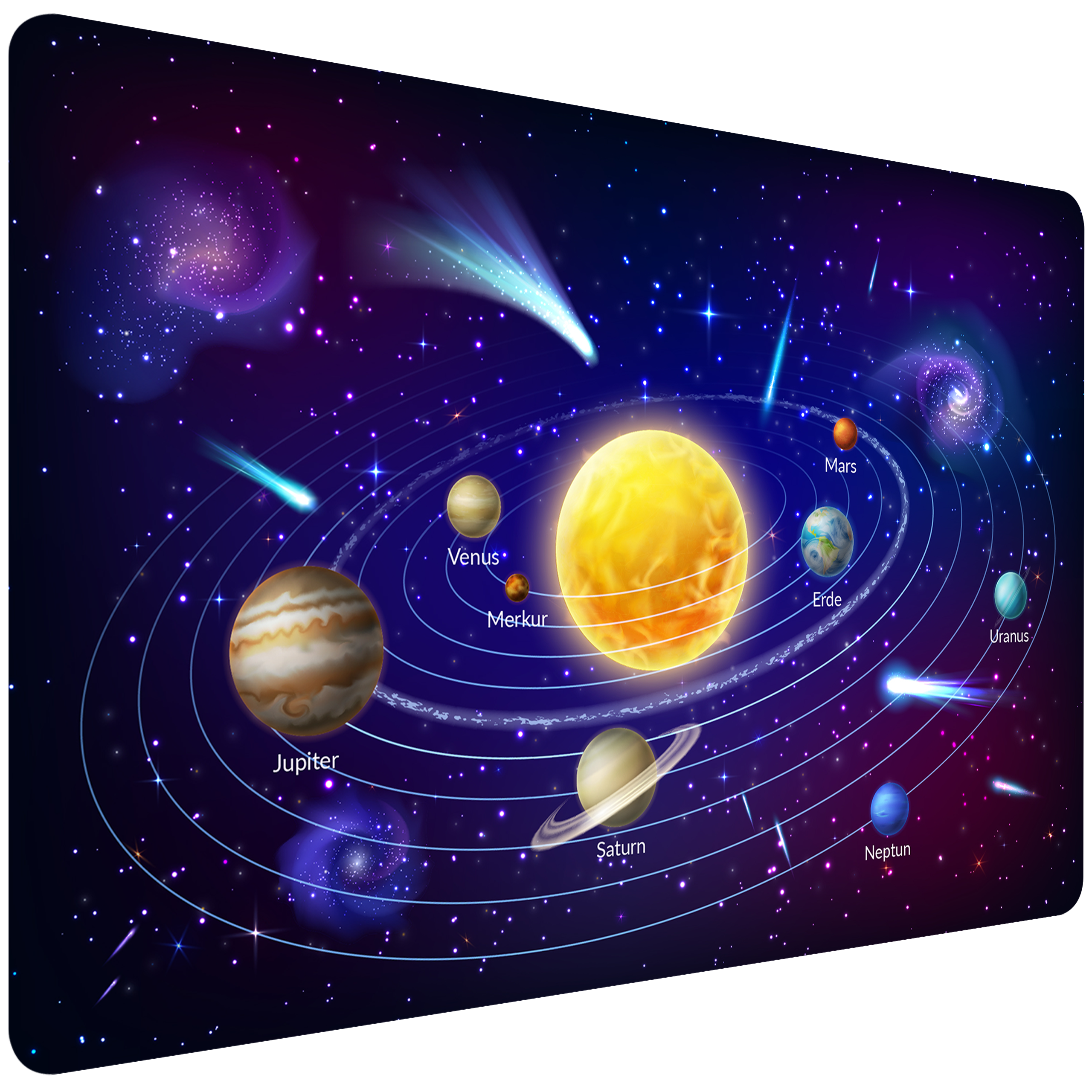 Die Schreibtischunterlage Sonnensystem ist in verschiedenen Größen erhältlich, damit du die passende für deinen Schreibtisch auswählen kannst. Ganz gleich, ob du einen kleinen Schreibtisch oder eine großzügige Arbeitsfläche besitzt !
